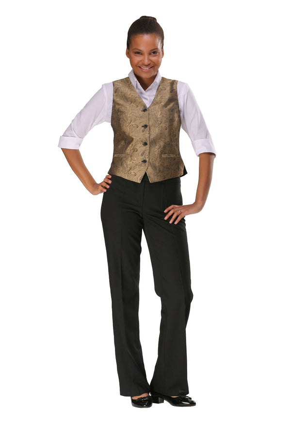 Klasyczna kamizelka damska na podszewce, zapinana na cztery guziki (w standardzie guziki plastikowe w kolorze kamizelki). Posiada cięcia pionowe dopasowujące do sylwetki oraz regulację za pomocą klamerki z tyłu na plecach. Dwie kieszonki w ramce zmieszczą najbardziej potrzebne akcesoria.