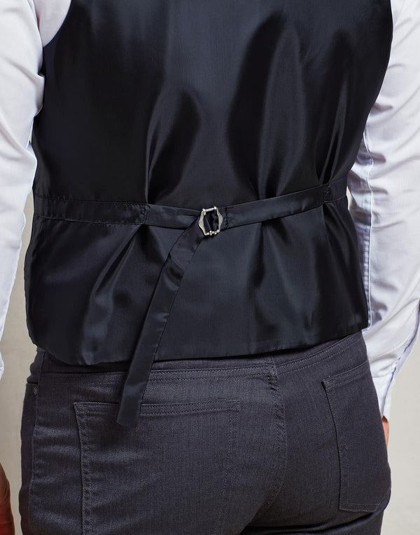 Elegancka kamizelka męska zapinana na 5 guzików, z dwiema kieszeniami z przodu i satynowym tyłem. Model na podszewce, z regulacją z tyłu.