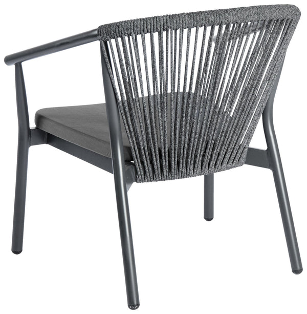 Wysokiej jakości fotel zewnętrzny wykonany z malowanej proszkowo aluminiowej ramy i oparcia z wikliny Rope (98% polipropylenu + 2% przędzy poliestrowej). Siedzisko wykonane z tekstylnego pokrycia. Odporne na warunki atmosferyczne i promieniowanie UV. Możliwie sztaplowanie. Nadaje się do użytku na zewnątrz. W zestawie plastikowe ślizgacze. Dostarczany w stanie zmontowanym.
