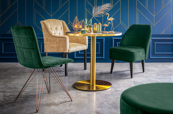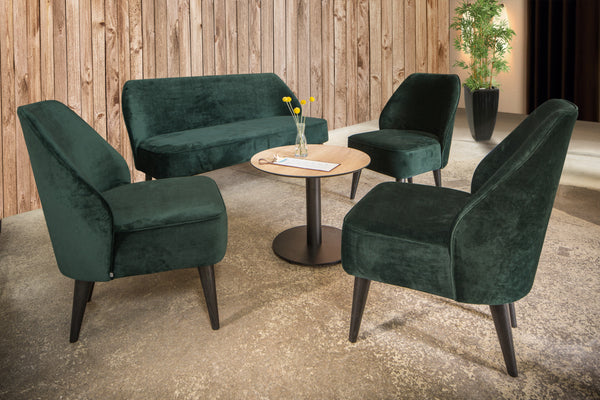 Nowoczesny fotel obity aksamitną tkaniną (100% poliester). Wysoki komfort siedzenia. Odporny na ścieranie i ognioodporny. Nadaje się wyłącznie do użytku wewnętrznego. Zamów pasującą sofę w tym samym czasie. Nóżki nie wchodzą w skład zestawu. Należy zamówić osobno.