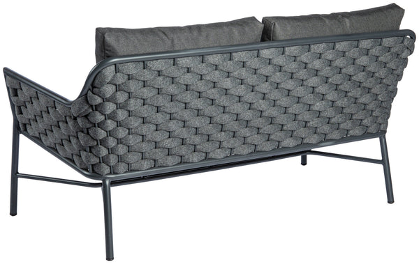 Sofa 2-osobowa wykonana z malowanej proszkowo aluminiowej ramy i wikliny Rope (98% polipropylenu + 2% przędzy poliestrowej). Zawiera poduszkę na siedzisko wykonaną z tkaniny olefinowej (100% polipropylen), zdejmowaną i nadającą się do prania w temperaturze 30°. Odporny na promieniowanie UV i światło. Nadaje się do użytku na zewnątrz. Dostarczane w stanie zmontowanym. Zamów pasujący fotel lub krzesło w tym samym czasie.