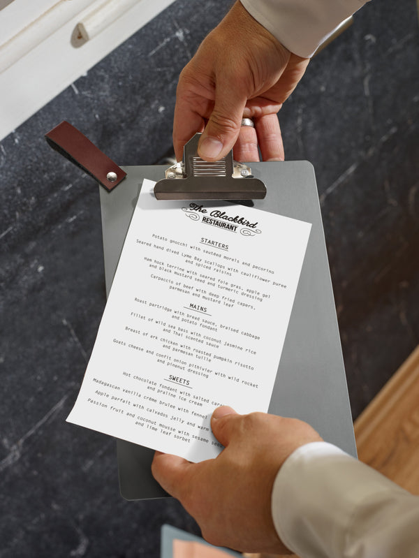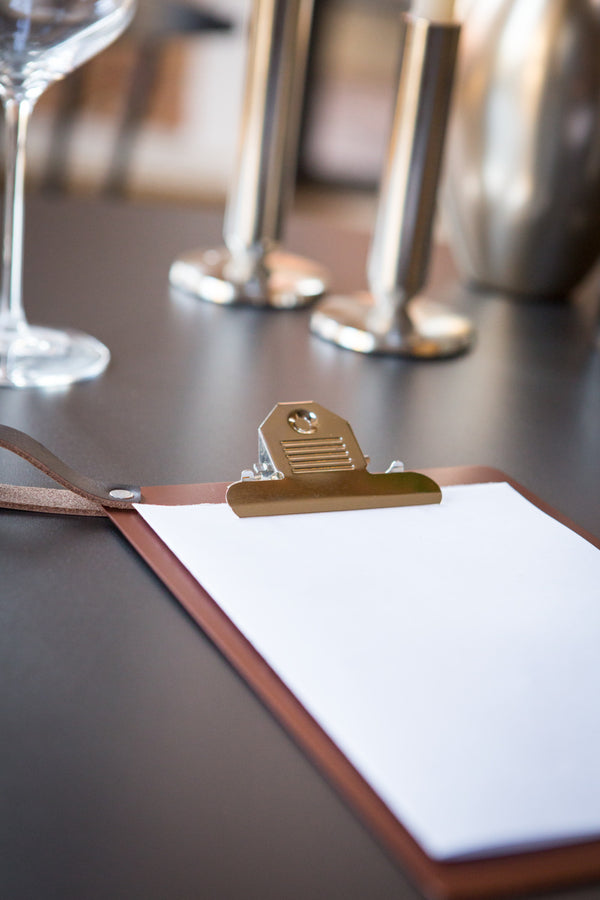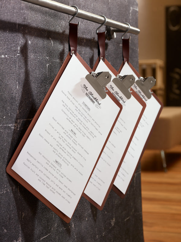 Codzienne menu w formacie A5. Wykonane z anodyzowanego aluminium ze zintegrowanym, trwale przymocowanym klipsem i pętelką z imitacji skóry do zawieszania. Wytrzymały. Odporny na zarysowania. Dostępny w kilku kolorach.