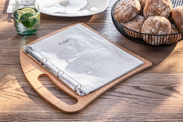 Menu wykonane z fornirowanego drewna w formacie A4 z praktycznym uchwytem ułatwiającym przenoszenie. Własny projekt VEGA. Można czyścić wilgotną ściereczką. Nie nadaje się do mycia w zmywarce.