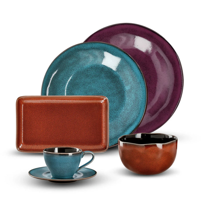 Kolorowa seria zastawy stołowej wykonana z kamionki w modnych kolorach. Z nieregularnymi krawędziami i gradientami kolorów. Każdy element jest unikalny. Nadaje się do mycia w zmywarce i używania w kuchence mikrofalowej. Waga płaskiego talerza o średnicy 27 cm: 970 g.
