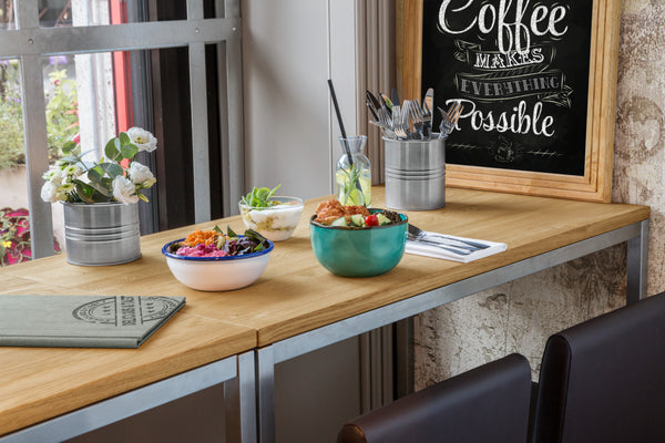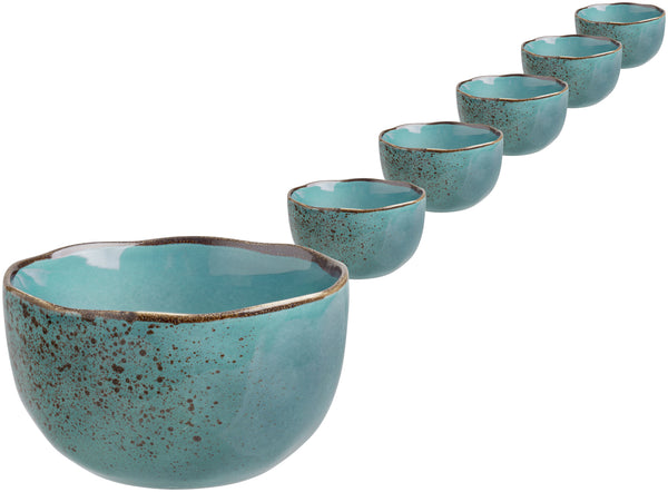 Miska z kolorowej kamionki. Z nieregularnymi brzegami i plamkami. Każdy element jest niepowtarzalny. Można myć w zmywarce i używać w kuchence mikrofalowej.