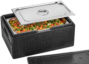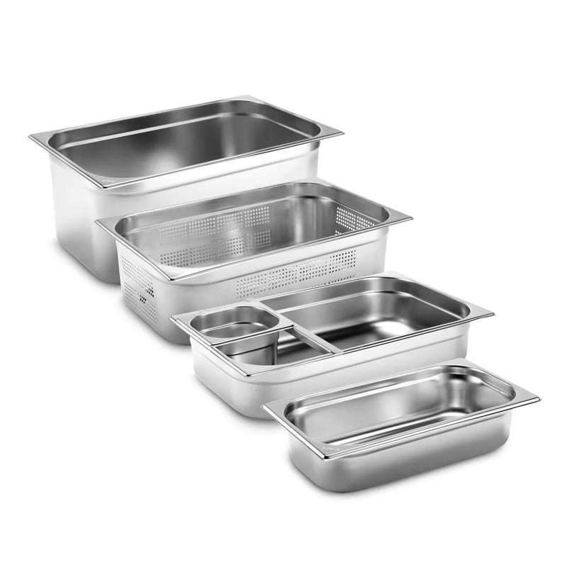 Standaryzowane pojemniki na żywność i pokrywki wykonane ze stali nierdzewnej. Grubość materiału 0,7 mm. Z możliwością układania w stosy. Nadają się do transportu oraz utrzymywania zimna i ciepła. Niekompatybilne z innymi seriami GN. Nadają się do zmywarek.