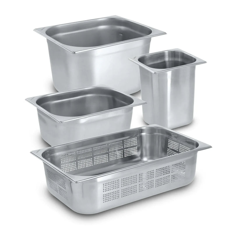 Standaryzowane pojemniki na żywność i pokrywki wykonane ze stali nierdzewnej. Grubość materiału 0,6 mm. Z praktyczną krzywką do układania w stosy. Nadają się do transportu i utrzymywania zimna i ciepła. Niekoniecznie kompatybilne z innymi seriami GN. Można myć w zmywarce.