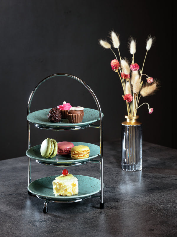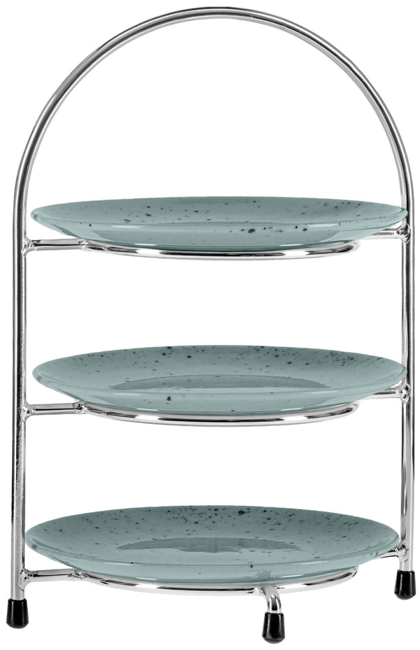 Trzypoziomowa etażerka wykonana ze stali chromowanej. Dostarczana z pasującymi talerzami. Klasyczny design. Łatwa w pielęgnacji.