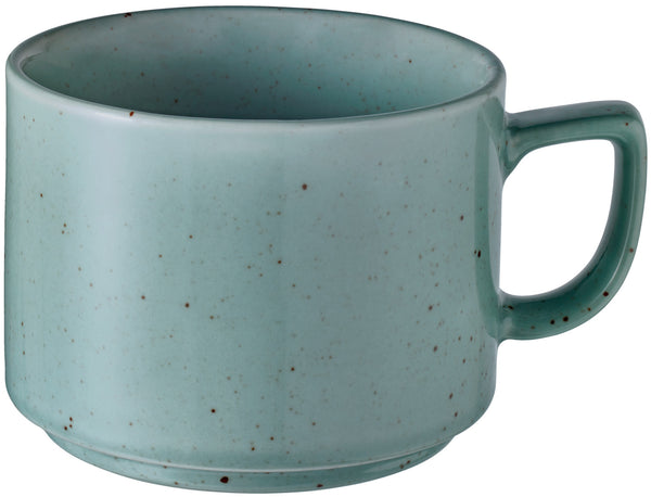 Kolorowa porcelanowa filiżanka do kawy ozdobiona nieregularnymi plamkami. Spodek pasuje do wszystkich rozmiarów filiżanek. Kubki i filiżanki można sztaplować, myć w zmywarce i używać w kuchence mikrofalowej.