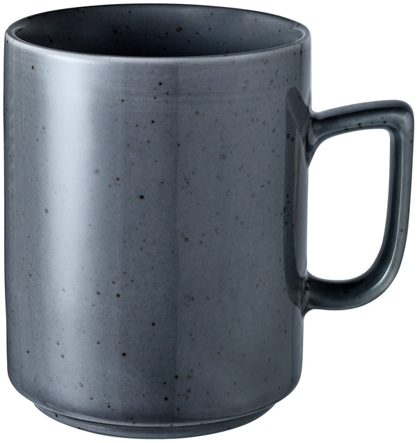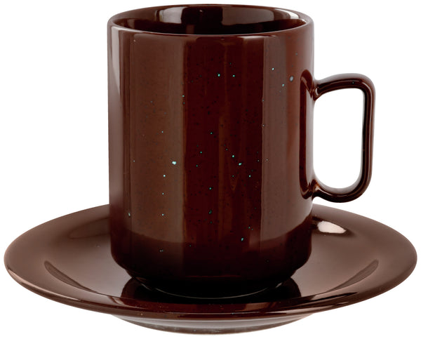 Kubek z serii kolorowej porcelany ozdobionej nieregularnymi plamkami. Spodek pasuje do wszystkich rozmiarów filiżanek. Kubki i filiżanki można sztaplować. Można myć w zmywarce i używać w kuchence mikrofalowej.