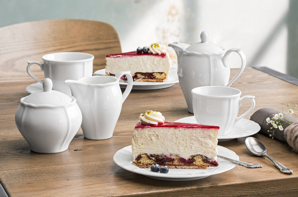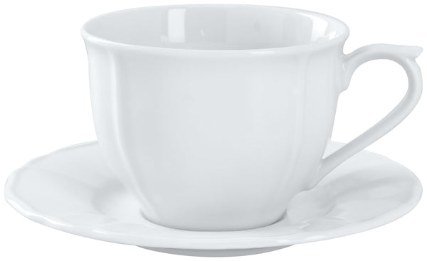 Biała filiżanka do kawy z mlekiem urzekająca urokiem vintage. Subtelny relief i figlarne dekoracyjne krawędzie tworzą nostalgiczne akcenty. Można myć w zmywarce i używać w kuchence mikrofalowej.