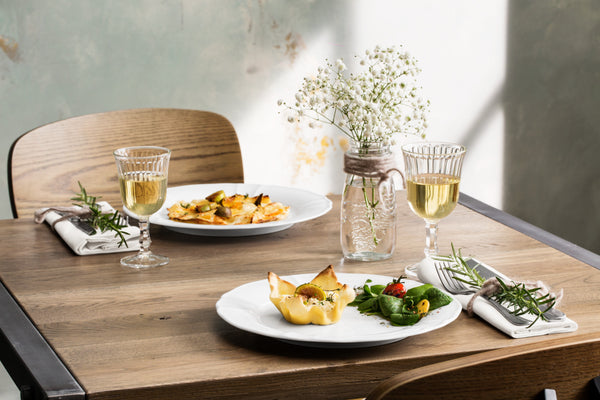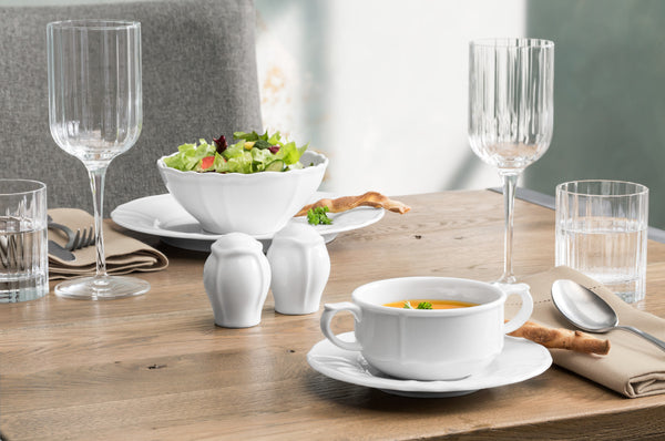 Sosjerka z białej porcelany. Subtelny relief i figlarne dekoracyjne krawędzie tworzą nostalgiczne akcenty. Można myć w zmywarce i używać w kuchence mikrofalowej.