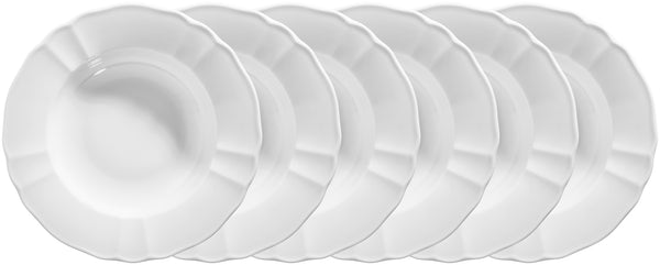 Talerze wykonane z białej porcelany. Subtelny relief i figlarne dekoracyjne krawędzie tworzą nostalgiczne akcenty. Można myć w zmywarce i używać w kuchence mikrofalowej.