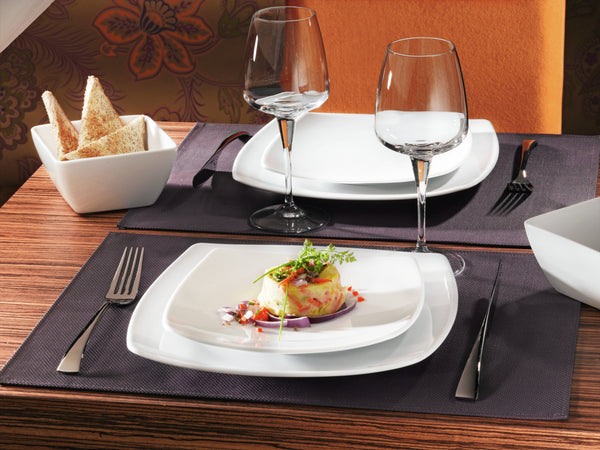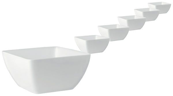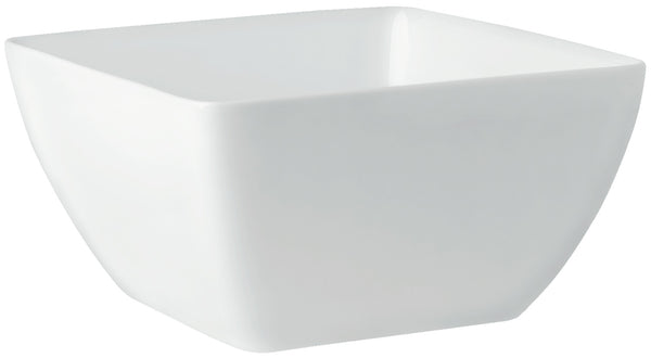 Miska z białej porcelany. Kwadratowa forma, dostępna w różnych rozmiarach. Można myć w zmywarce i używać w kuchence mikrofalowej.
