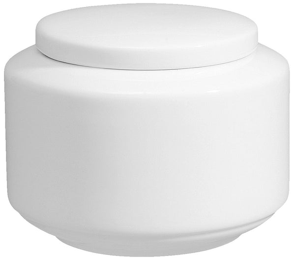 Biała cukiernica z porcelanową pokrywką. Prosta, ponadczasowa forma. Można myć w zmywarce i używać w kuchence mikrofalowej.