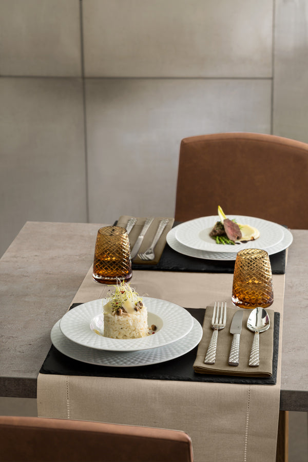 Talerze z białej porcelany ozdobione reliefem w kształcie rombu na krawędzi talerza. Można idealnie łączyć z serią sztućców Brilio i szklankami Divida. Można myć w zmywarce i używać w kuchence mikrofalowej.