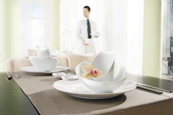 Porcelanowa miseczka o okrągłym kształcie z wgłębieniem na krawędzi. Można myć w zmywarce i używać w kuchence mikrofalowej.