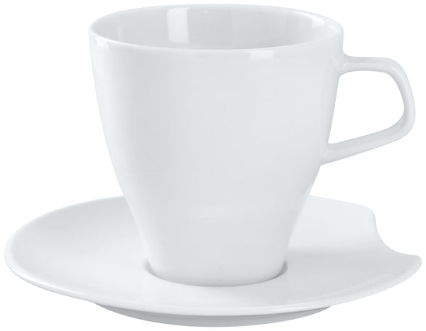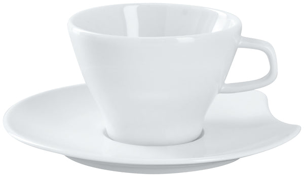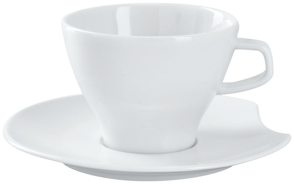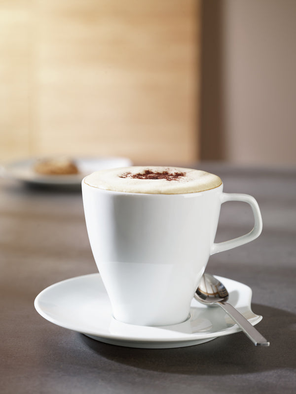 Biały porcelanowy spodek z wycięciem na brzegu. Pasuje do filiżanek do kawy, cappuccino oraz do kubków. Można myć w zmywarce i używać w kuchence mikrofalowej.