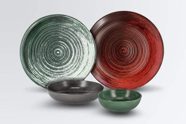 Skorzystaj z naszego zestawu próbnego. W zestawie następujące wzory: Talerz płaski Ø 25 cm czerwony Talerz płaski z rantem Ø 24 cm biały/antracyt Talerz głęboki Ø 17 cm szary Miska ØxW 13x4,5 cm zielona