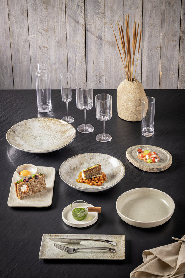 Kolorowe talerze porcelanowe ozdobione nadrukiem cyfrowym. Prostokątny kształt. Można myć w zmywarce i używać w kuchence mikrofalowej
