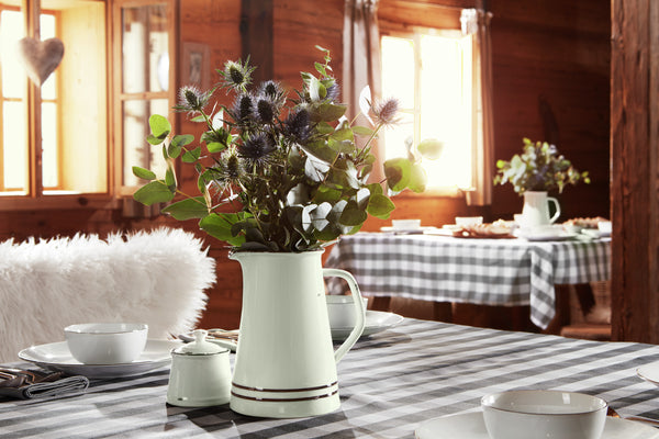 Cukiernica z pokrywką wykonana z porcelany w stylu retro. Z czarną obwódką i ozdobnymi wyszczerbieniami na krawędziach i powierzchniach zewnętrznych. Można myć w zmywarce i używać w kuchence mikrofalowej.