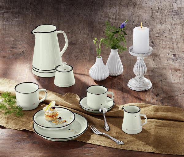 Porcelanowa filiżanka do kawy w stylu retro. Z czarną obwódką i ozdobnymi wyszczerbieniami na krawędziach i powierzchniach zewnętrznych. Można myć w zmywarce i używać w kuchence mikrofalowej.
