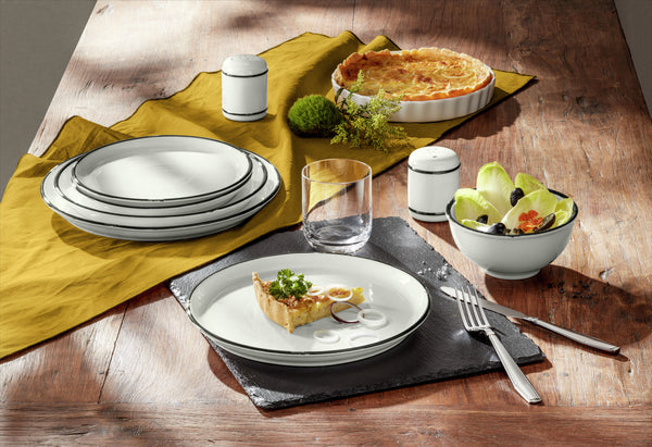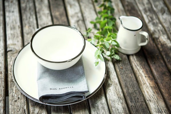 Porcelanowa miska w stylu retro. Z czarną obwódką i ozdobnymi wyszczerbieniami na krawędziach i powierzchniach zewnętrznych. Można myć w zmywarce i używać w kuchence mikrofalowej.