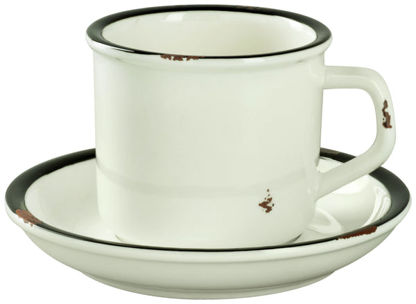 Porcelanowy spodek pod filiżankę do kawy w stylu retro. Z czarną obwódką i ozdobnymi wyszczerbieniami na krawędziach oraz powierzchniach zewnętrznych. Można myć w zmywarce i używać w kuchence mikrofalowej.