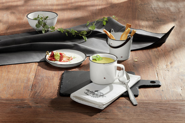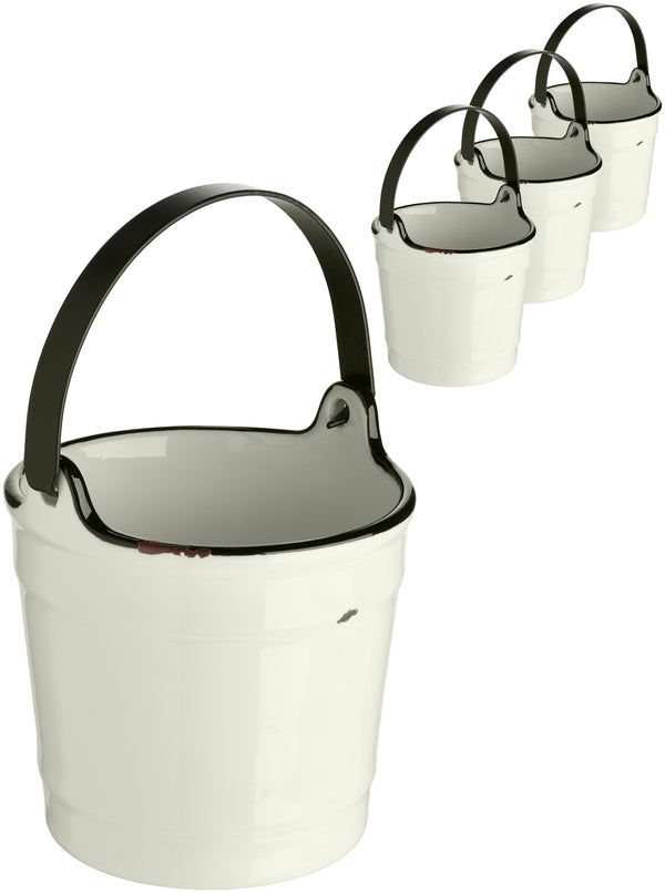 Porcelanowe wiaderko w stylu retro. Z czarną obwódką i ozdobnymi wyszczerbieniami na krawędziach i powierzchniach zewnętrznych. Małe wiadro może np. być używany jako kosz na drobne odpady na stole. Posiada plastikowy uchwyt. Można myć w zmywarce.