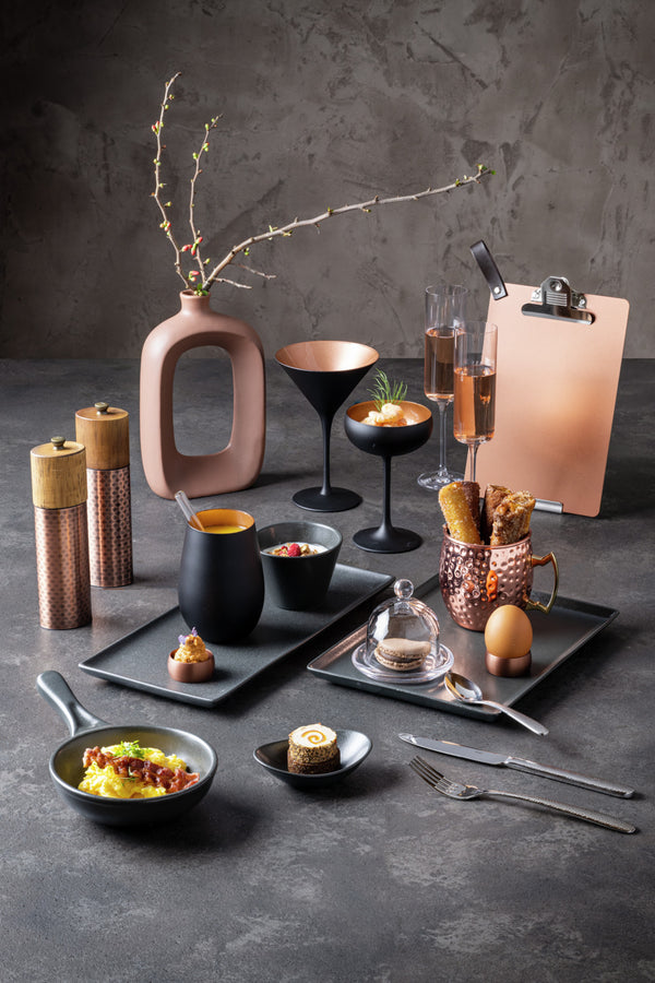 Modna miseczka wykonana z porcelany z matowym, czarnym szkliwem imitującym ceramikę. Można myć w zmywarce i używać w kuchence mikrofalowej.