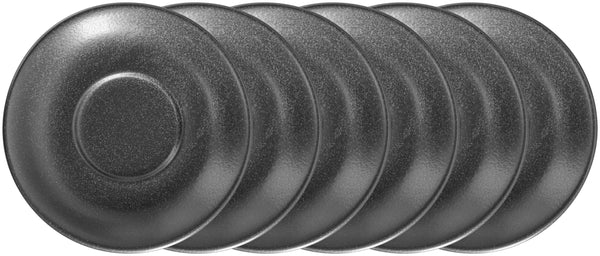 Modny spodek pod filiżankę do kawy wykonany z porcelany z matową czarną emalią imitującą ceramikę. Można myć w zmywarce i używać w kuchence mikrofalowej.