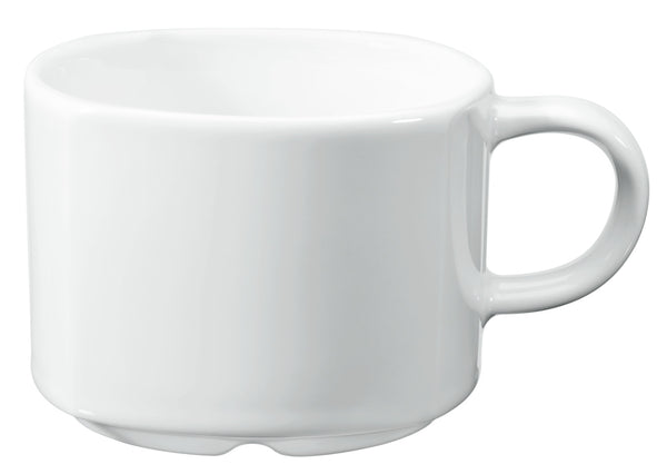 Filiżanka do kawy z białej porcelany. Prosty projekt. Można myć w zmywarce i używać w kuchence mikrofalowej.