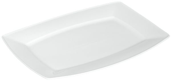 Talerz z białej porcelany. W kształcie kwadratu. Prosty projekt. Można myć w zmywarce i używać w kuchence mikrofalowej.