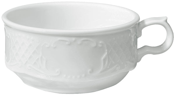 Filiżanka do herbaty z białej porcelany ozdobiona filigranowym reliefem. Można myć w zmywarce i używać w kuchence mikrofalowej.