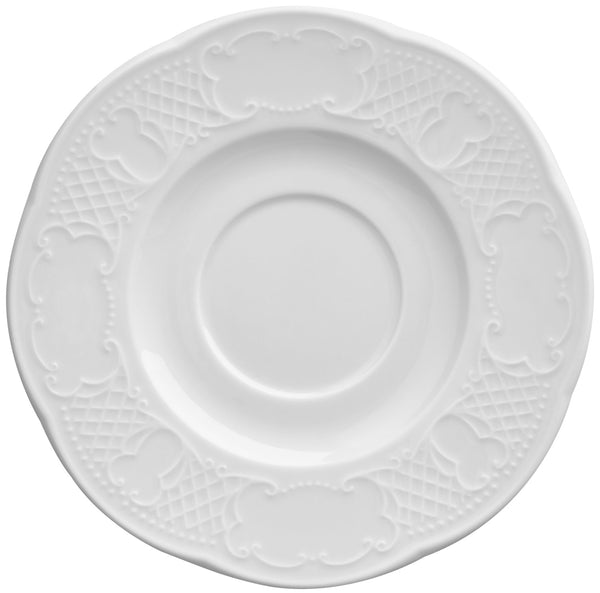 Spodek pod filiżankę do kawy/herbaty lub kubek, wykonany z białej porcelany. Z filigranowym reliefem. Można myć w zmywarce i używać w kuchence mikrofalowej.