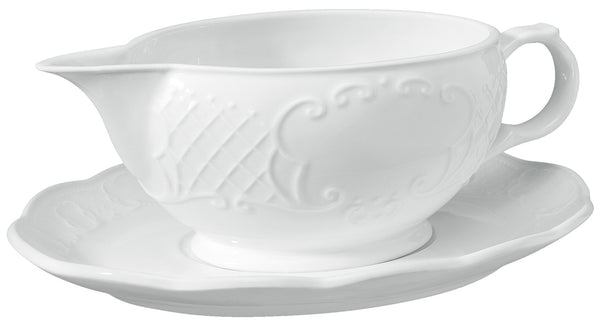 Spodek do sosjerki wykonany z białej porcelany. Z filigranowym reliefem. Można myć w zmywarce i używać w kuchence mikrofalowej.