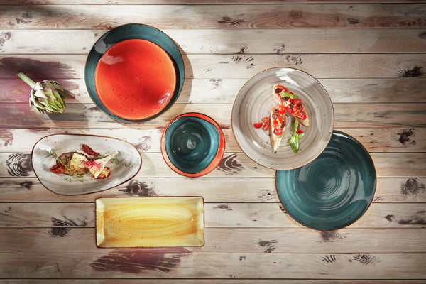 Kolorowy talerz wykonany z porcelany o rustykalnym wyglądzie. Ozdobiony nieregularnymi plamkami. Każdy element jest niepowtarzalny. Jakość porcelany premium. Można myć w zmywarce i używać w kuchence mikrofalowej