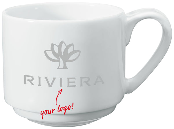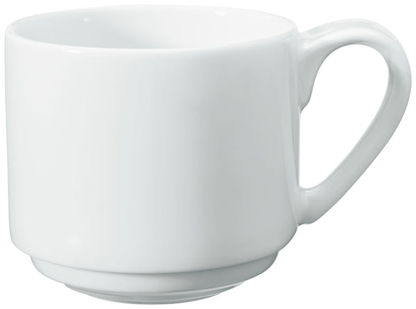 Filiżanka do kawy z białej porcelany. Nie można sztaplować. Prosty, elegancki kształt. Z płynnymi przejściami uszek. Można myć w zmywarce i używać w kuchence mikrofalowej.