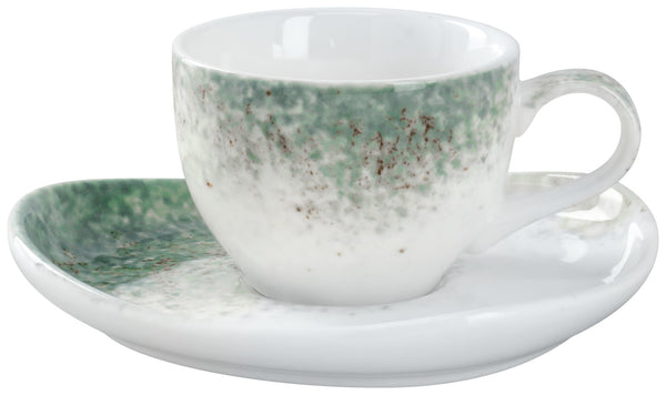 Kolorowy porcelanowy spodek do espresso o nieregularnym, organicznym kształcie. Dostępny w różnych odcieniach. Można myć w zmywarce i używać w kuchence mikrofalowej.