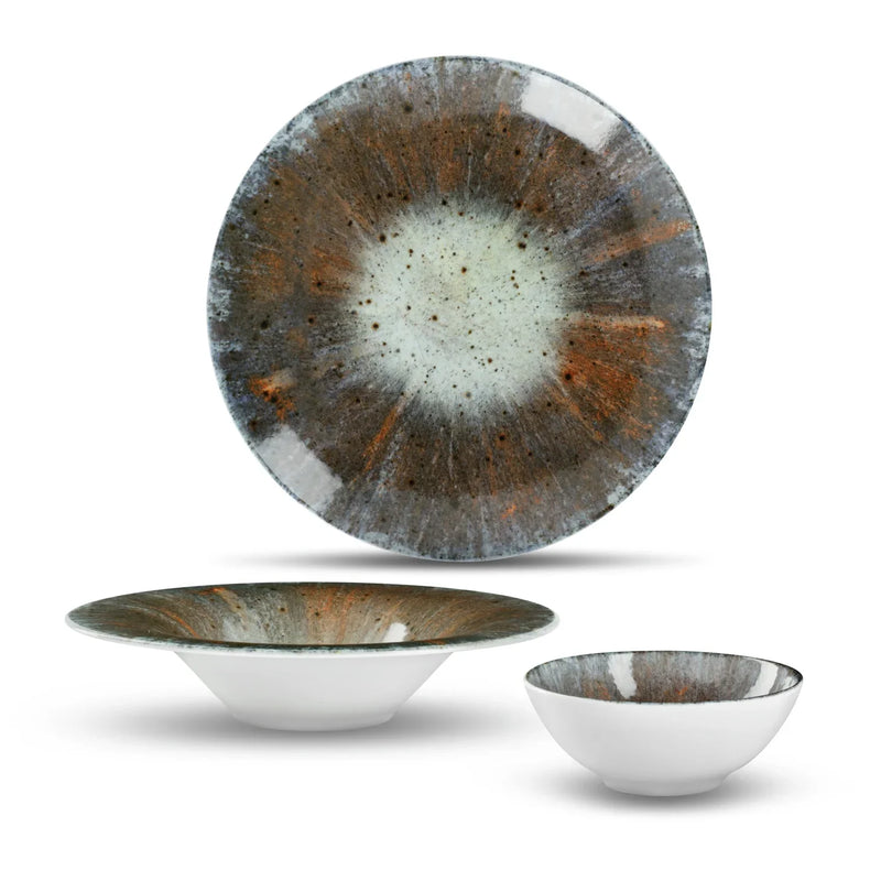 Kolorowa seria porcelany z dekoracją w druku cyfrowym. Bez rantu. Nadaje się do mycia w zmywarce i używania w kuchence mikrofalowej. Waga płaskiego talerza o średnicy 24,5 cm: 640 g.