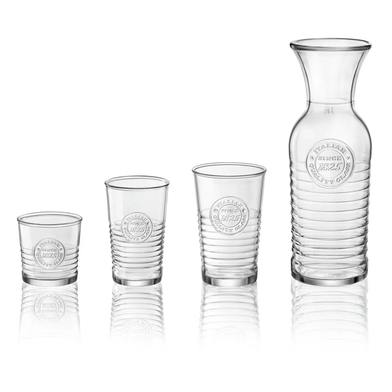 Solidne szkło z rowkowaną strukturą i dekoracyjnym stemplem. Można układać w stosy i myć w zmywarkach.