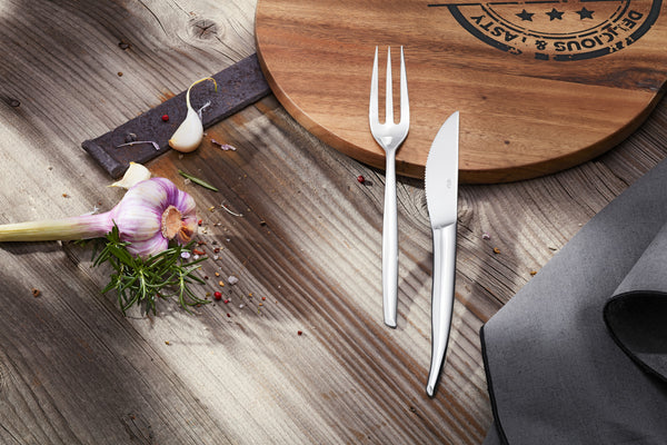 Stal nierdzewna chromowana 13/0. Nowoczesny nóż do steków z ząbkowaną krawędzią w autorskim projekcie VEGA. Wypolerowany na wysoki połysk. Grubość materiału 3,4 mm odpowiednia dla gastronomii (mierzona w najmocniejszym punkcie widelca do steków). Można myć w zmywarce.