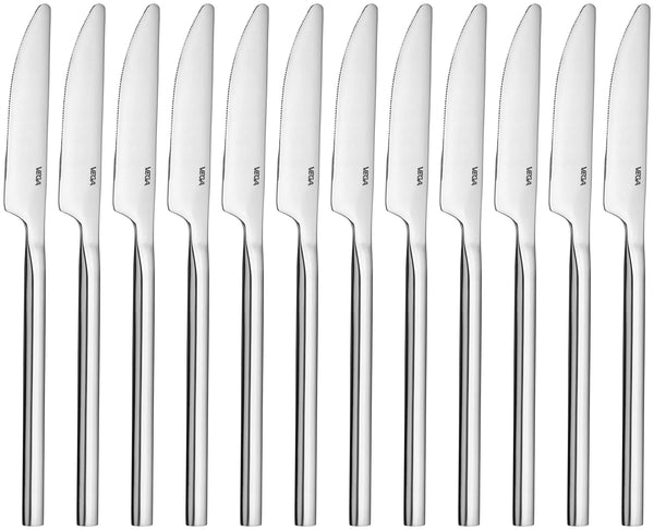 Stal nierdzewna chromowana 13/0. Nóż obiadowy o prostym, eleganckim kształcie. Okrągły uchwyt. Wypolerowany na wysoki połysk. Grubość materiału 7,5 mm odpowiednia dla gastronomii (mierzona w najmocniejszym miejscu widelca obiadowego). Można myć w zmywarce.