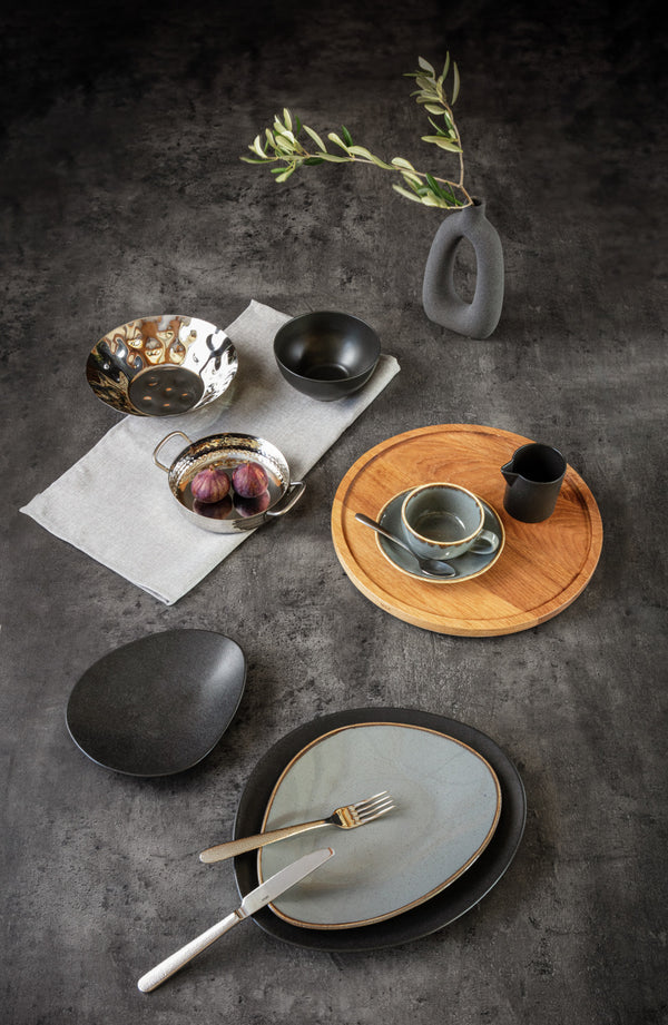 Stal nierdzewna chromowana 13/0. Nóż obiadowy z filigranowym, młotkowanym reliefem z przodu i z tyłu. Wypolerowany na wysoki połysk. Grubość materiału 3,5 mm odpowiednia dla gastronomii (mierzona w najmocniejszym punkcie widelca obiadowego). Można myć w zmywarce.