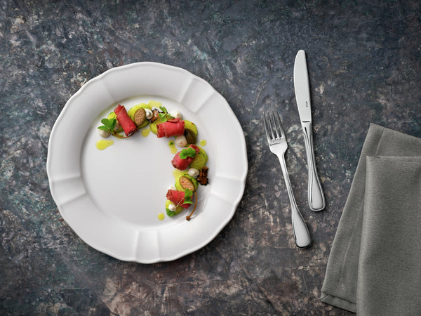 Stal nierdzewna chromowana 13/0. Klasyczny nóż obiadowy w słynnym kształcie łopatki. Wypolerowany na wysoki połysk. Grubość materiału 2,5 mm odpowiednia dla gastronomii (mierzona w najmocniejszym miejscu widelca obiadowego). Można myć w zmywarce.
