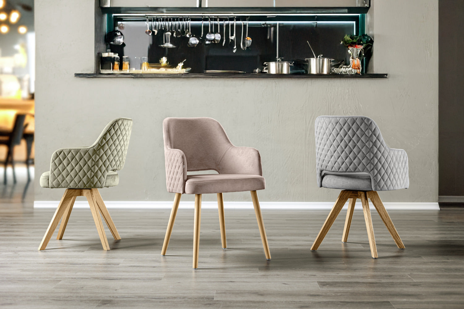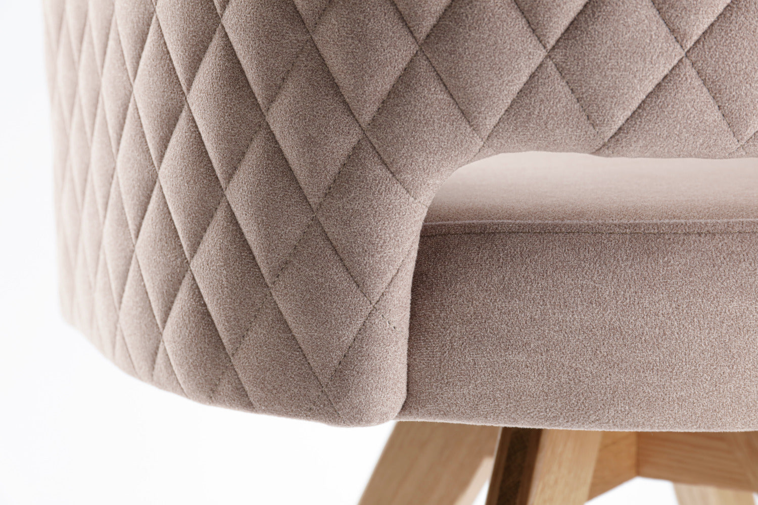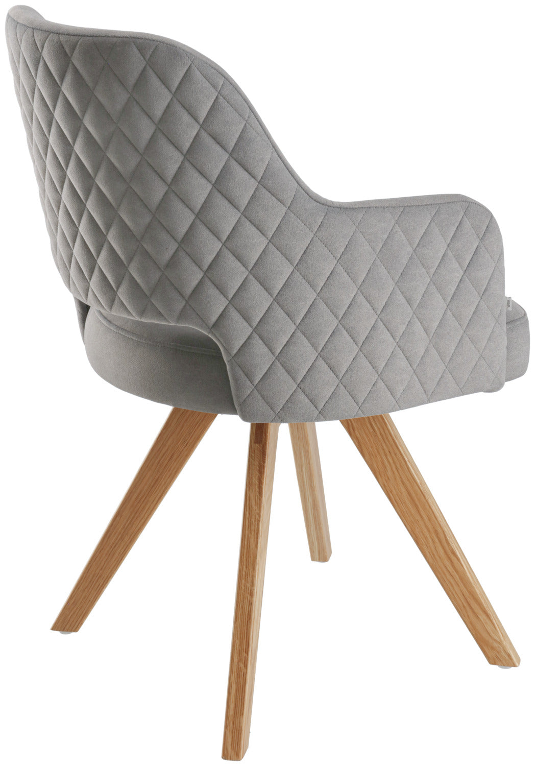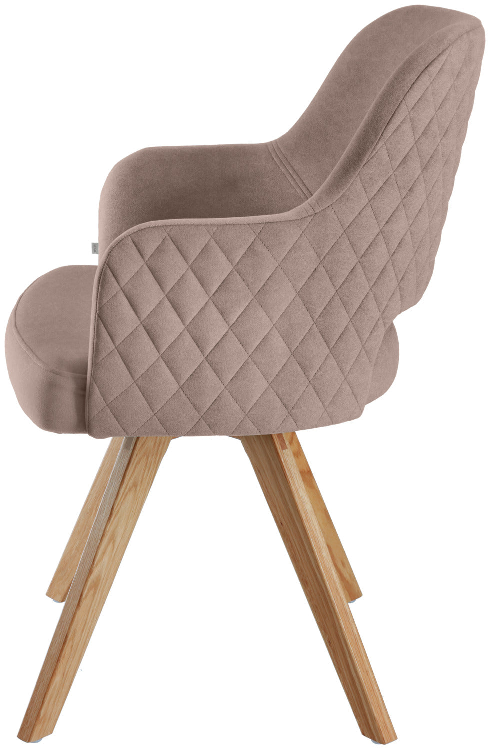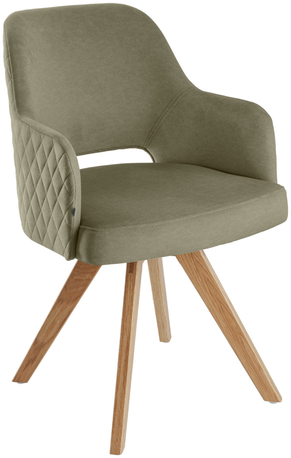 Funkcjonalne krzesło obrotowe z dębową ramą i obiciem z tkaniny przypominającej aksamit. Oparcie ozdobione pikowaniem w romby. Zintegrowany mechanizm obrotowy, skorupa siedziska może być przesuwana do 90° w obie strony. Z mechanizmem powrotu - krzesło automatycznie powraca do pierwotnej pozycji. Pokrycie ognioodporne. Nadaje się tylko do użytku wewnątrz pomieszczeń. Dostarczane zmontowane, wraz z plastikowymi ślizgaczami.