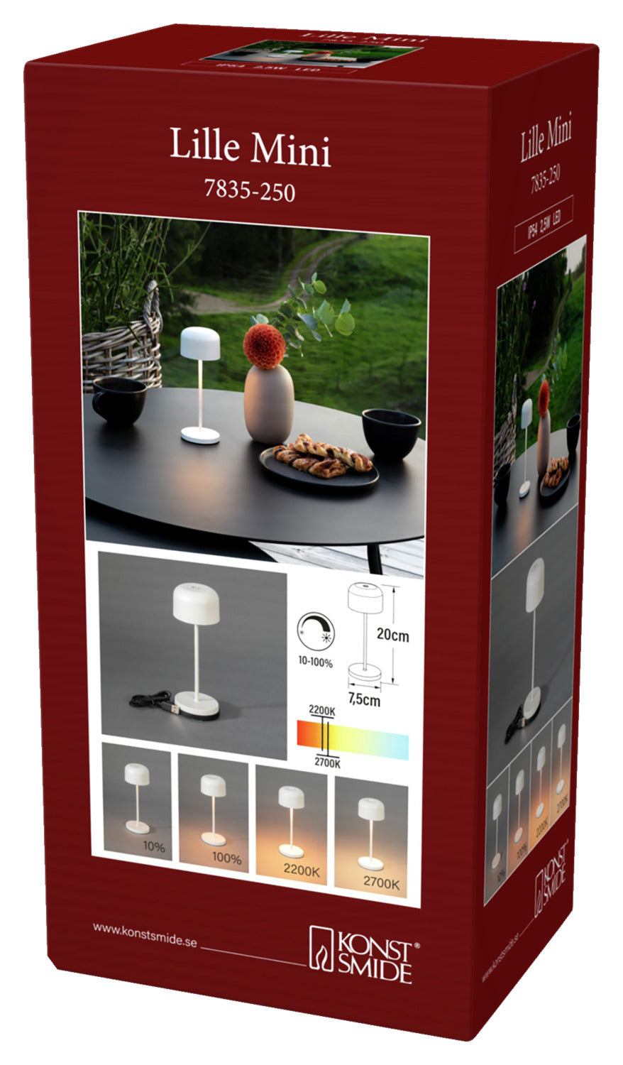 Dodaj stylowe i dyskretne oświetlenie do swojego domu, restauracji lub pokoju hotelowego, wewnątrz lub na zewnątrz, dzięki lampie stołowej Lille Mini w eleganckiej czerni. Dzięki niewielkiej wysokości wynoszącej zaledwie 20 cm dyskretnie i gustownie komponuje się ze stołami - idealnie nadaje się do użytku w restauracjach, na stołach lub w ogrodzie. Światło emitowane jest poniżej poziomu oczu, co zapobiega oślepianiu. Dzięki funkcji bezstopniowego ściemniania można dostosować intensywność światła do nastroju. Główne cechy: - Odporność na warunki atmosferyczne zgodnie z IP54 - nadaje się do użytku na zewnątrz - Tylko 20 cm wysokości - idealna do użytku na stołach bez dominowania nad nimi - Światło poniżej poziomu oczu - nieoślepiające światło zapewniające przyjemną atmosferę - Bezstopniowe ściemnianie - indywidualna kontrola światła dla każdego nastroju Dane techniczne: - zasilanie: 230 V, 50 Hz, źródło światła: LED, wymienne, moc: ok. 4-6 W, barwa światła: ciepła biel (ok. 2200-2700 K) Postaw na wysokiej jakości, stylowe oświetlenie, które harmonijnie wkomponuje się w każde otoczenie. Lille Mini to idealny wybór - elastycznie dostosowuje się do Twoich potrzeb i tworzy przyjemną atmosferę. Kabel do ładowania w zestawie.