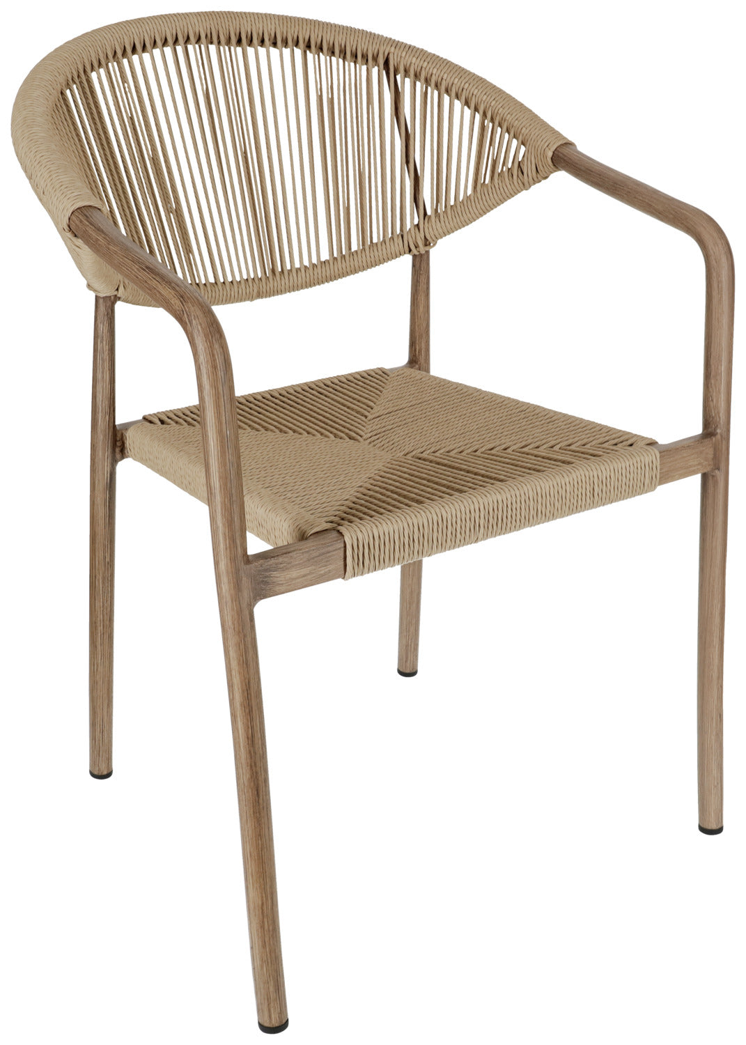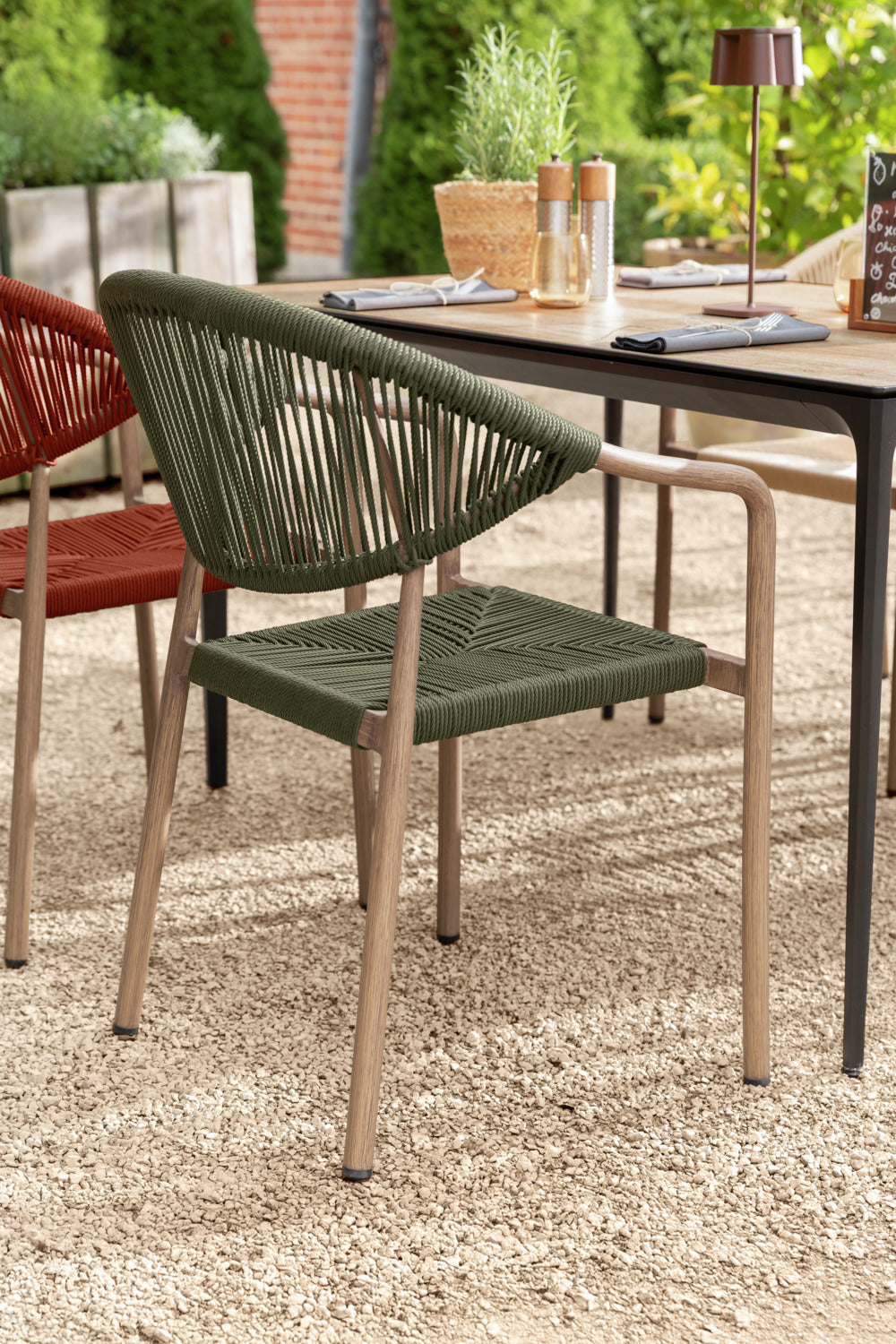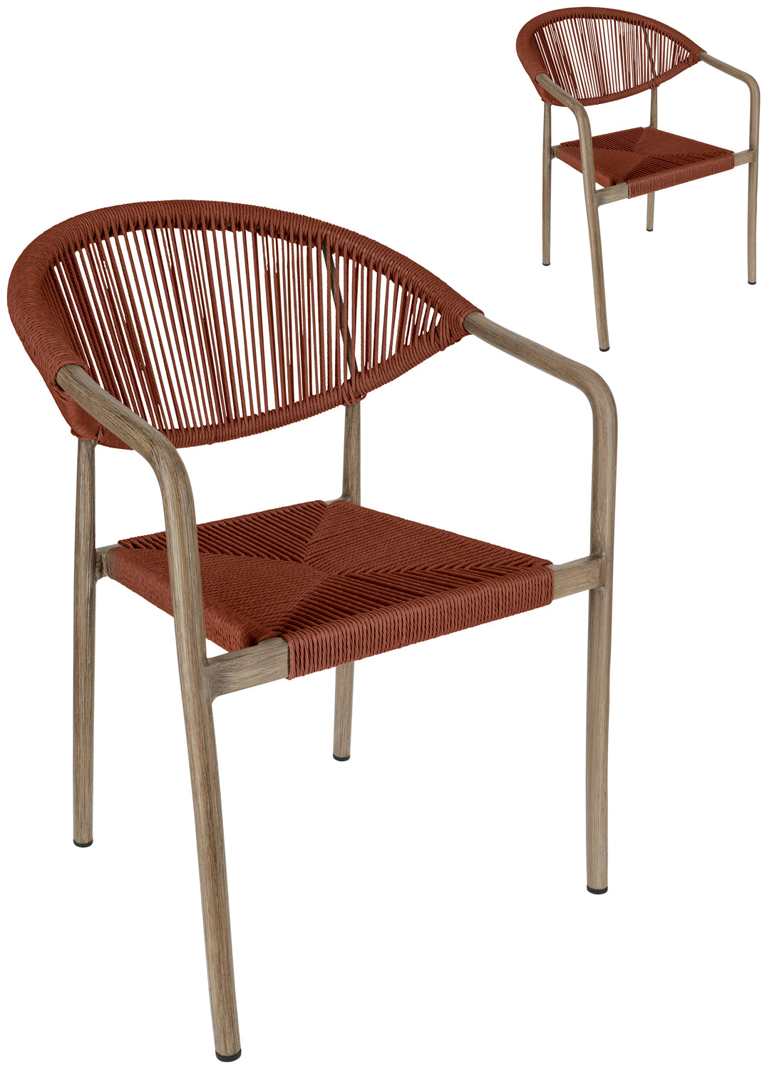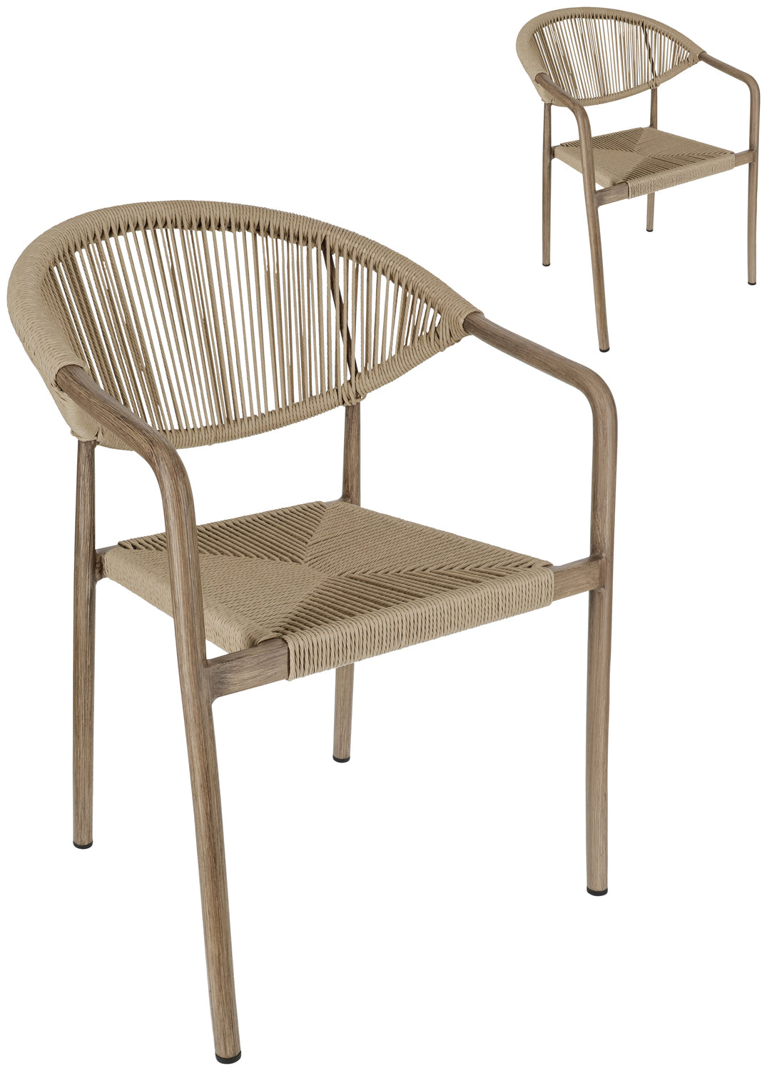 Wybierz krzesło ogrodowe, które doskonale łączy design i funkcjonalność - do Twojej restauracji, kawiarni lub hotelu. Wytrzymała aluminiowa rama o nowoczesnym wyglądzie drewna zapewnia profesjonalny wygląd, a wytrzymałe pokrycie poliestrowe Rope może wytrzymać najtrudniejsze wymagania codziennej gastronomii. Krzesło jest odporne na warunki atmosferyczne i promieniowanie UV, a także jest szybkoschnące - idealne do obszarów zewnętrznych, które są często czyszczone lub używane w każdych warunkach pogodowych. Dzięki możliwości sztaplowania, krzesła można szybko i sprawnie przechowywać, co jest dużą zaletą. Plastikowe ślizgacze chronią powierzchnie podłogi i ułatwiają obsługę. Krzesło zewnętrzne jest dostarczane w pełni zmontowane - idealne do szybkiej konfiguracji bez dodatkowego wysiłku.