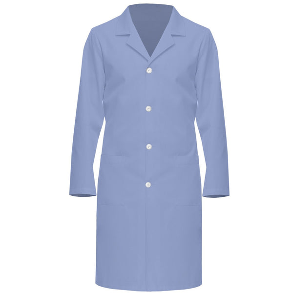 Długi fartuch męski z klasycznym kołnierzem z klapami. Model z długim rękawem, dwiema kieszeniami dolnymi i jedną górną. Fartuch zapinany na guziki, z paskiem regulującym dopasowanie w talii.