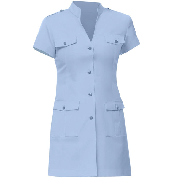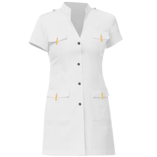 Fartuch damski ze stójką i krótkim rękawem. Posiada po dwie patki górne i dolne ozdobione kolorowymi tasiemkami lub guzikami. Dwie kieszenie zmieszczą potrzebne akcesoria, a rozcięcia po bokach ułatwią ruch. Model zapinany na cztery guziki, z zaszewkami pionowymi dopasowującymi do sylwetki.